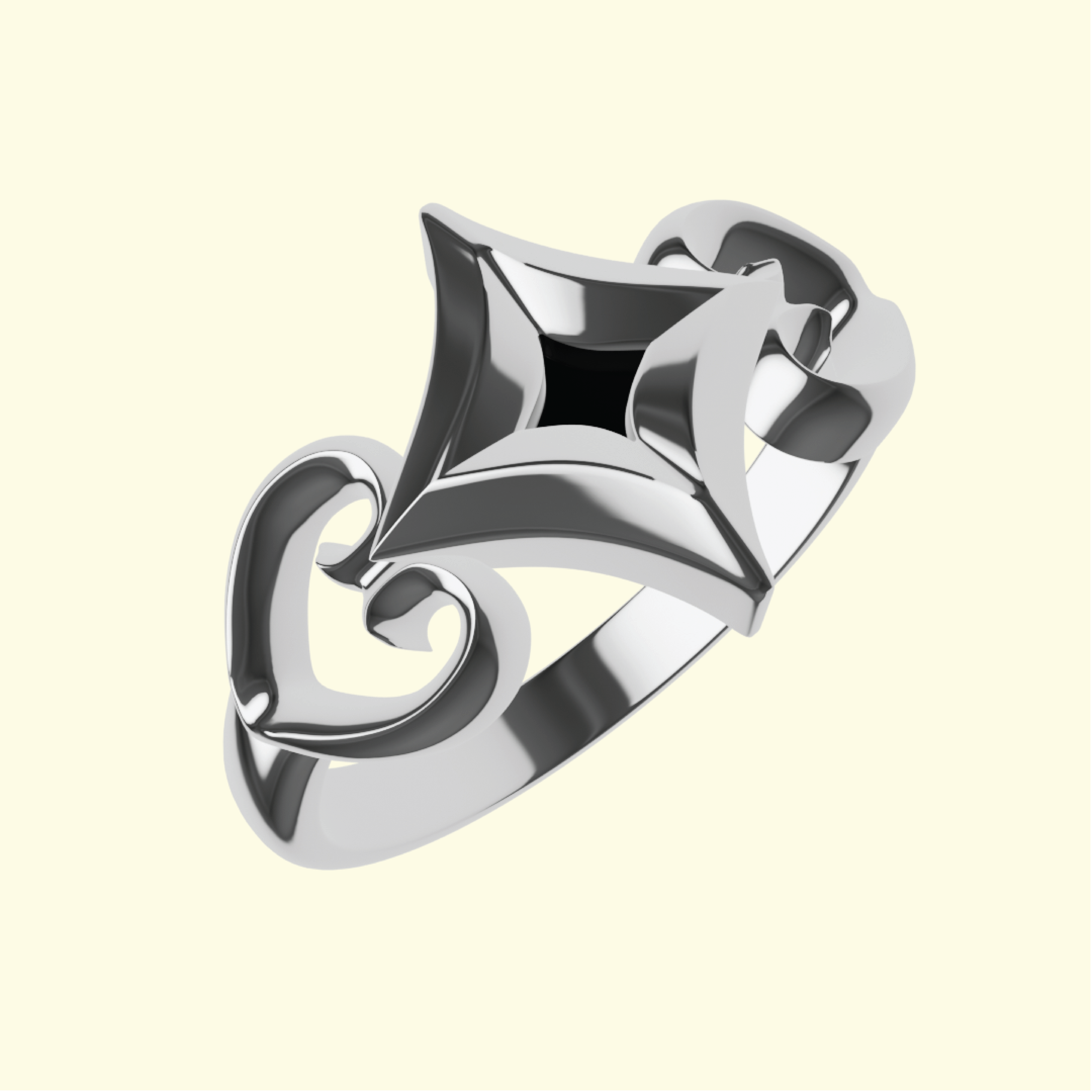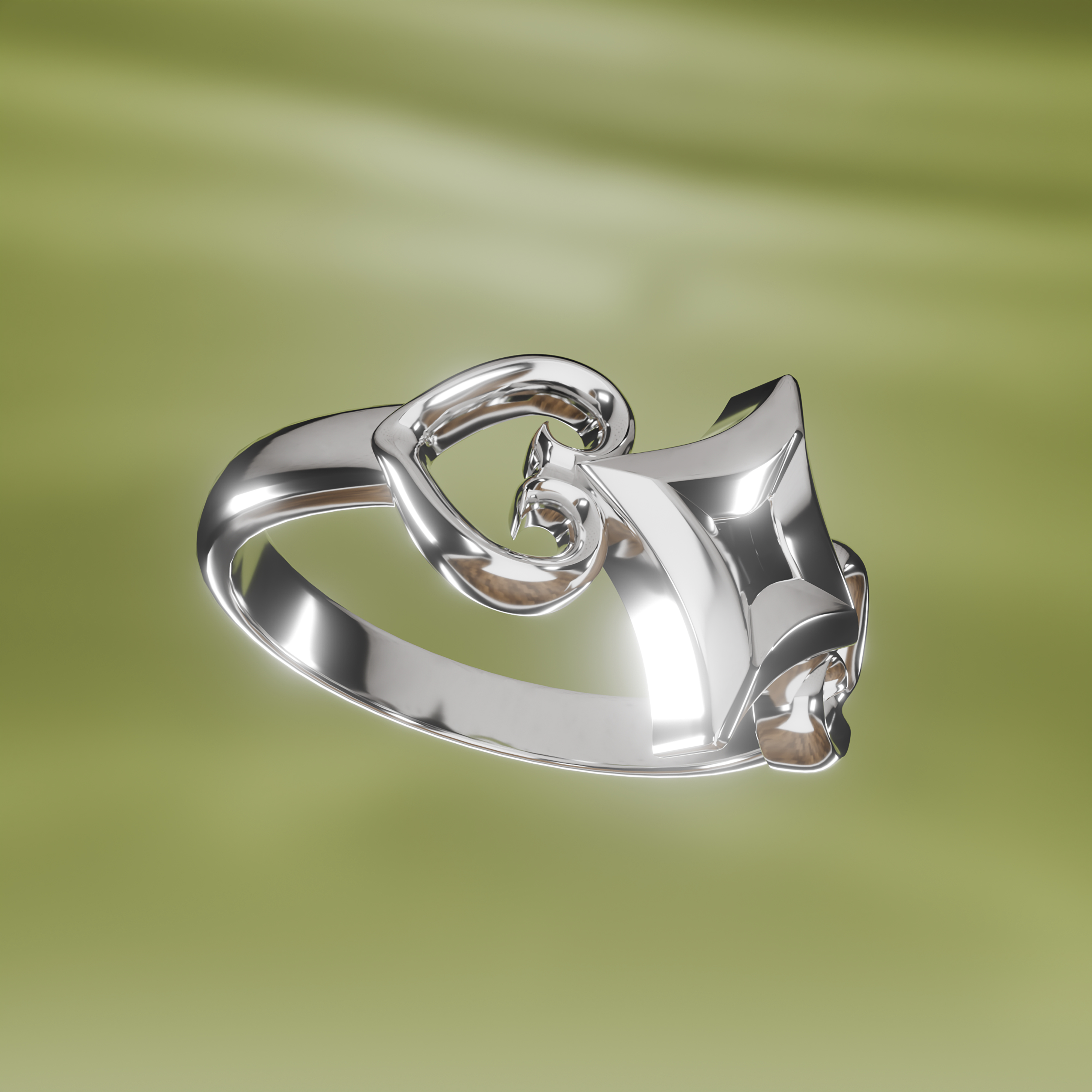 This is a 925 silver ring featuring a modern and flowing design. The centerpiece consists of an elegant, angular geometric motif resembling a star or diamond shape, connected seamlessly to the band by soft, intertwined curves. These flowing elements evoke a sense of movement and harmony, creating a balance between bold structure and delicate artistry. The polished silver finish enhances its timeless and versatile appeal, making it a sophisticated piece suitable for various occasions.