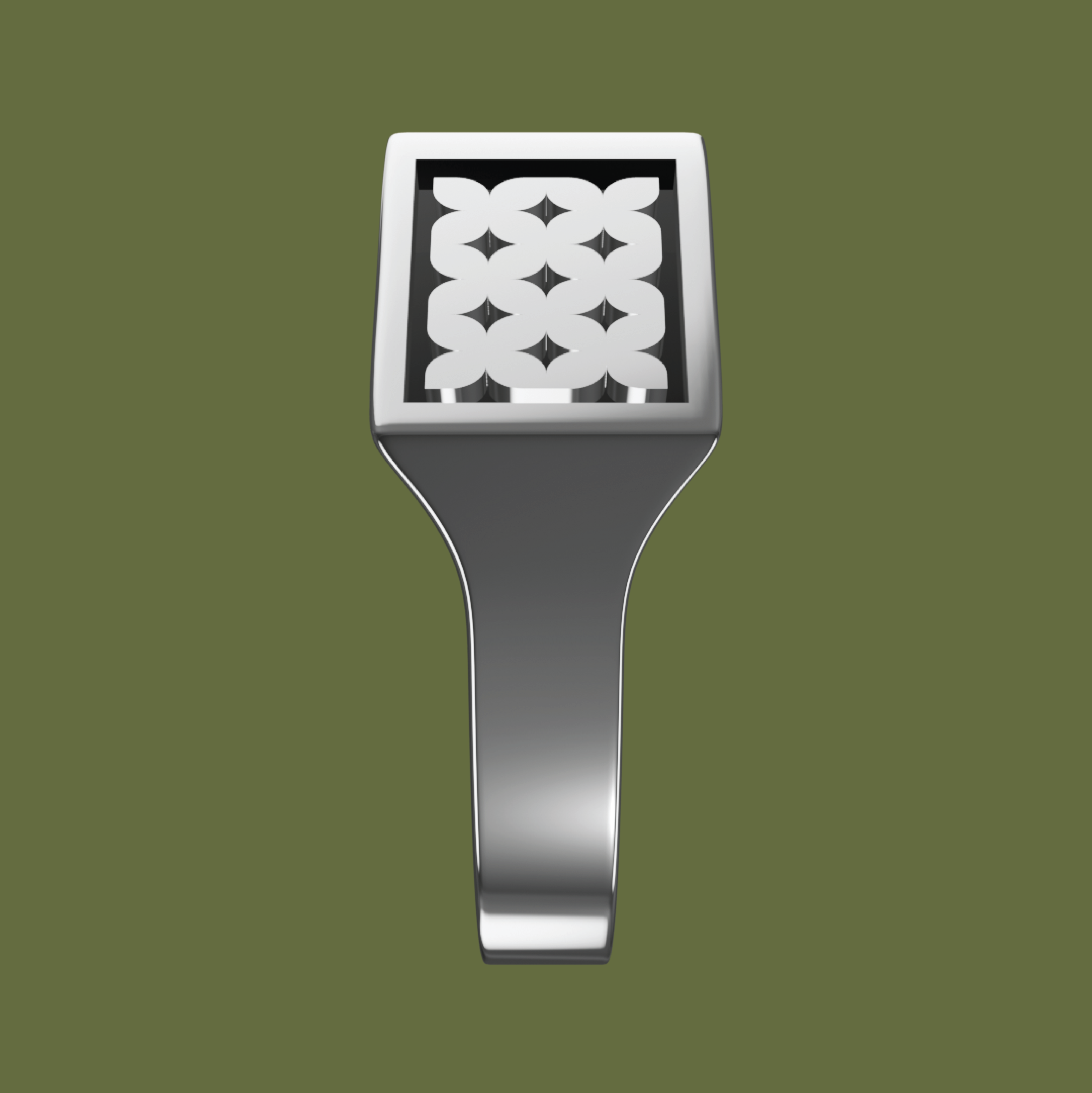 This 925 silver ring features a bold and timeless design inspired by the traditional Indonesian Kawung batik motif. The square-shaped top showcases the Kawung pattern, symbolizing purity and balance, alongside a complementary stylized motif, both rendered in a striking black contrast against the polished silver. The sleek band enhances the simplicity of the design, while the intricate detailing connects it to Indonesia’s rich cultural heritage. A perfect blend of tradition and modern elegance.